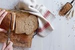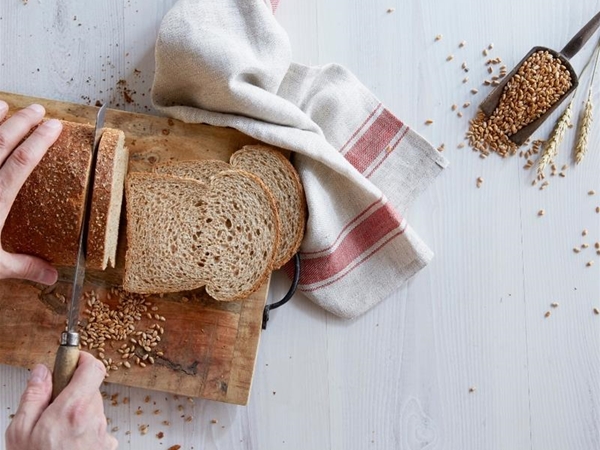 Een volkorenbrood dat is gemaakt van 100% tarwevolkorenmeel, gedecoreerd met zemelen, waardoor het brood vol vezels zit.