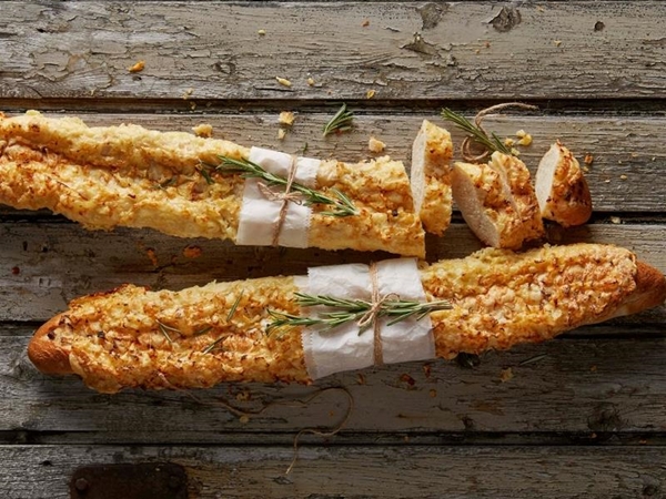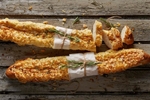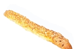 Een wit stokbrood dat is opgemaakt met kaas, uien en kruiden. Erg lekker met ons knoflooksausje!