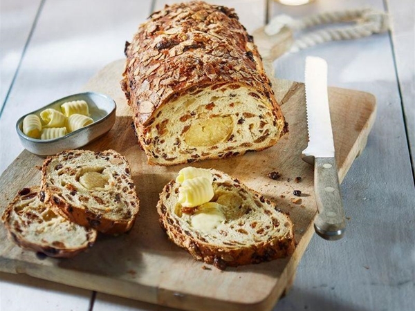 Heerlijke stol gevuld met noten, krenten, rozijnen en zuivere amandelspijs. Gedecoreerd met gebrande amandel schaafsel.
