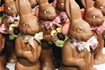 Deze paashaas is gemaakt van faitrade chocolade en zijn standaard afgemaakt met een strik en een goed gevulde paasmand op zijn rug.