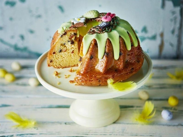 Deze Smeuïge cake is gevuld met krenten, rozijnen, stukjes appel en is afgemaakt met een jam, fondant en paaschocolade. De tulband wordt verpakt in een mooie plastic koker.